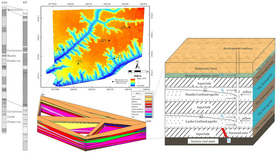 The vertical geological structure was divided into seven layers, including three aquifers, three aquicludes, and a coal seam, by integrating similar and thin lithologies. The aquifers are Quaternary phreatic aquifers, Cretaceous Huanhe Formation confined aquifers, and Cretaceous Luohe Formation confined aquifers. The hydrogeological section is shown in Figure 3. Because of the discontinuous distribution of aquifers in the Huanhe Formation and Luohe Formation, there is a need to consolidate the aquifers within the same layer for convenient calculation. The Quaternary phreatic aquifers are composed of loess, and confined aquifers in the Cretaceous are composed of siltstone, fine sandstone, coarse sandstone, medium sandstone, and medium conglomerate. The aquicludes are mainly silty mudstone, mudstone, and clay.