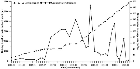 With a linear increase in the driving length, when it reached 1410.4 m in the Hetaoyu coal field, the water-conducted fracture zone appeared, resulting in the groundwater drainage of 517.42 m3/h. It would generate another, new water-conducted fracture zone when the driving length reached 3083.2 m, and groundwater drainage increased to 806.83 m3/h. So, in order to ensure the safety of coal production, the drainage capacity of the pumps should be greater than 806.83 m3/h in future coal mining.