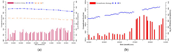 The variations of groundwater levels for different aquifers are shown in Figure 6a,b. It could be noticed that the trends of groundwater level varied from each other, especially in #3 the groundwater level had been rising with the increase in groundwater drainage. That phenomenon indicated that although there was a large amount of groundwater discharge in the coal mine area, the influence on regional groundwater flow was limited. The distance between the main inclined shaft and #3 was about 3 km, which might be the threshold of the drainage influence.