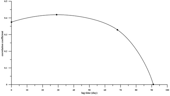 It is well known that the impact of groundwater drainage is greatest in the mining area and gradually decreases with increasing distance. According to the above analysis, the variation of groundwater level in #2 was lagging behind that of #1. In order to quantify the lag time, the correlation coefficient was calculated between #1 and #2. The result is shown in Figure 7.
