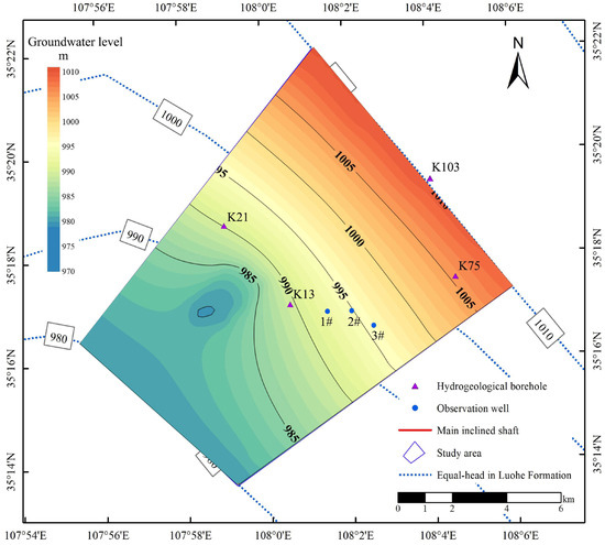 Therefore, in order to analyze the effect of the main inclined shaft excavation on the groundwater and the groundwater dynamics under coal-8 mining in the future, the study area took the main inclined shaft as the center; other boundaries were parallel or vertical to the equal-head line of the confined aquifer of Luohe Formation, which is situated at 107°59′2″–108°04′32″ E and 35°15′59″–35°20′3″ N, with an area of 32.3 km2 within the Hetaoyu coalfield. There were four geological boreholes and three hydrological holes in this area, named #1, #2, and #3, as shown in Figure 2. The #1 recorded the groundwater level in Luohe Confined aquifer from November 2019 to May 2021. The #3 recorded the groundwater level in Huanhe Confined aquifer from January 2019 to November 2019. The #2 recorded the mixed groundwater level of the Quaternary aquifer, Huanhe Confined aquifer, and Luohe Confined aquifer from November 2019 to May 2021. The isolevel map of the Luohe Formation aquifer is shown in Figure 2.