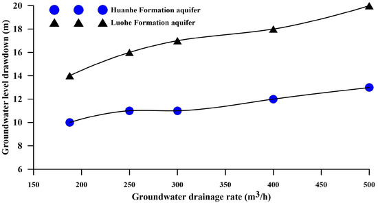 When the groundwater discharge was up to 250 m3/h, the water level of the Huanhe Formation aquifer and Luohe Formation aquifer dropped by about 11 m and 16 m, respectively. A descending funnel of about 2.4 km2 was formed in the drainage area, which affected the characteristics of local groundwater flow. Based on the numerical calculation, the descending trend of groundwater level for Cretaceous Huanhe Formation and Luohe Formation aquifers under different groundwater discharges is shown in Figure 10.