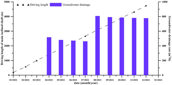 As the driving length of the main inclined shaft increases, the new water conducting would appear until the height of the water-conducted fracture zone was larger than the thickness of the above aquicludes. Then, the above geological structure model and the hydraulic conductivity would change accordingly. According to the trends of the driving length in Figure 5, the future groundwater drainage was predicted by Equation (6). The simulation result is shown in Figure 11.