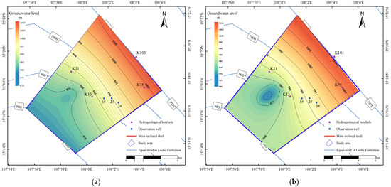 The groundwater level contour map under the groundwater drainage rate was 806.83 m3/h: (a) the Huanhe Formation aquifers; (b) the Luohe Formation aquifer.