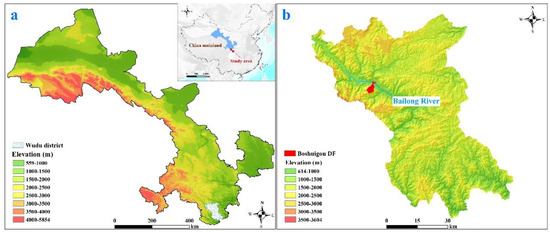 The Boshuigou debris flow is located in Wudu district, Longnan city, Southwest Gansu (Figure 1a). This region is situated in the transition zone from the second step to the third step on the Chinese continent and the intersection area of the Qinba mountain region, the Qinghai-Tibet Plateau, and the Loess Plateau. Wudu district is characterized by interleaving terrain of precipitous mountains and valley basins with a general terrain of high in the northwest and low in the southeast (Figure 1b). Correspondingly, the geomorphic unit of the study area and its vicinity can be classified as river valley landform (river terrace and alluvial–proluvial fan) and middle-high altitude mountain [3]. The river terrace is distributed along the Bailong River and its tributary, and the alluvial–proluvial fan is mainly observed in the Beiyu River. The middle-high altitude mountain is mainly distributed on both sides of the Bailong River. The left side (north side) of the Bailong River is constituted by the Devonian and Silurian phyllite; the right side (south side) of the Bailong River comprises the Carboniferous limestone.