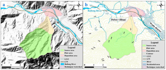 Panoramic (a) and planar view (b) of the Boshuigou debris flow. G212 and G75 are abbreviations of the Lanzhou–Longbang Highway and Lanzhou–Haikou Expressway, respectively.