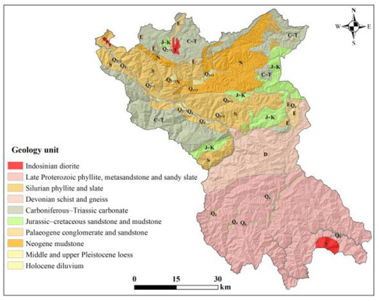 The outcropped strata of the study area and its vicinity consist of the Silurian phyllite and slate, the Carboniferous argillaceous limestone and siliceous limestone, and the Quaternary loess (Upper Pleistocene), colluvial deposit, residual deposit, alluvial–proluvial deposit and fluvial deposit (Figure 3) [27,28,29]. The Silurian phyllite and slate are mainly outcropped at the debris flow source area and weathered phyllite and slate pieces of size between 5 and 10 cm can be observed in the field. Interbedded layers of slate and phyllite with different weathering resistance provide a favorable lithology condition for debris flow source. The Carboniferous argillaceous limestone and siliceous limestone are the major sources of the coarse content of the debris flow, as they are not vulnerable to weathering, and collapses can be observed at the steep area. The Quaternary loess is mainly distributed at the upper stream, and shallow slope failures occur occasionally. The colluvial deposit and residual deposit are mainly derived from the weather slate and phyllite. The alluvial–proluvial deposit with a fan shape at the watershed outlet is the result from historical debris flow, and no obvious rhythmic bedding can be observed. The fluvial deposit is only located at the watershed outlet and belongs to the river terrace of the Bailong River.