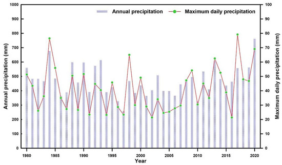 Annual precipitation and maximum daily precipitation of the study area from 1980 to 2020.