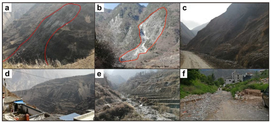 Main source of the Boshuigou debris flow: (a) landslide at the source; (b) rock collapse at the source; (c) collapse at the flow path; (d) slope erosion at the flow path; (e) deposits at the flow path; (f) deposits at the deposition area.