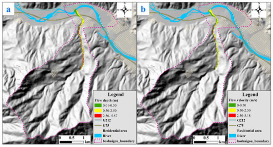 Flow depth (a) and flow velocity (b) of the Boshuigou debris flow under the 50-year return-period rainfall.