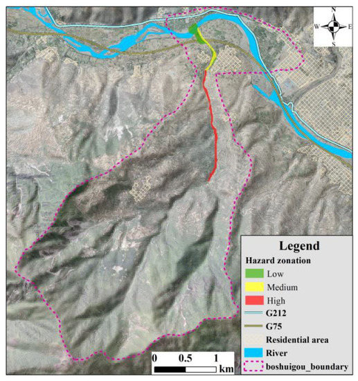 Hazard zonation of the Boshuigou debris flow.
