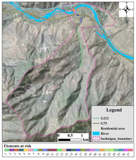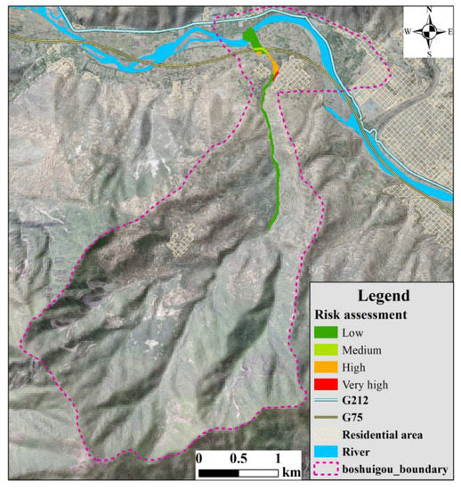 The total area of the flow path and deposition is approximately 0.129 km2. The area at very high risk is approximately 0.0026 km2, which accounts for 2.03% of the total area; the area at high risk is approximately 0.0152 km2, which accounts for 11.80% of the total area; the area at medium risk is approximately 0.0065 km2, which accounts for 5.00% of the total area; the area at low risk is approximately 0.1046 km2, which accounts for 81.17% of the total area. On this base, the risk zonation can be obtained (Figure 11). The area at very high risk appears in unit 10, which is located right side of the Boshuigou flow path, and the near residential area is at very high risk. Units 9, 11, 13, 17, and 22 are at high risk, and sparsely distributed constructions in these units are in danger; the area around the highway (G75) where units 14, 15, 18, and 23 are located is at medium risk; the other area is at low risk.