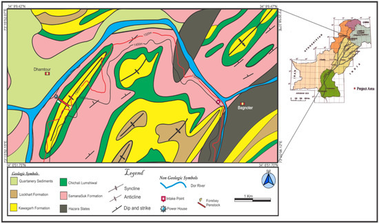 Presently, the Abbottabad district in Pakistan hosts ~1.182 million people. However, its population is increasing at a high rate. The district very commonly faces power shortages resulting in multiple spells of power load-shedding on a daily basis. Abbottabad is also a hub of educational institutions and industries and hosts tens of quality educational institutions of international repute and many small industries; some of these are higher education institutions internationally known for quality education and research. The continuous load shedding in the area is badly affecting educational and industrial activities currently because electricity plays a key role in running the laboratories, classrooms and related offices where at times uninterruptible power supply is required for weeks. If this fails, the experiments being carried out in the laboratories of higher education institutions or industries do not give the required results, and the quality of work is compromised, so there is a need to explore sources that can overcome these issues. The Dor River flows in the close vicinity of Abbottabad city, carries along a large suspended sediment load and falls into Tarbela reservoir. According to Sabir et al. [7], the Dor River is capable of producing a sufficient amount of hydroelectric energy that can be used locally as a closed system or added to the national grid. This work is designed to evaluate the suitability of Dor River for constructing a small hydro project. The objectives of the current research include (1) designing a small hydro project at Dor River; (2) choosing the suitable locations for the proposed hydropower project components; (3) evaluating the quality of rocks at selected sites through Rock Mass Classification system; (4) determining the hydropower and sedimentation potential of Dor River; (5) and evaluating the effect of Dor River siltation on Tarbela Reservoir. Moreover, the suitability of rocks present in the Dor River area as a construction material was also checked according to standard ASTM procedures, which is one of the additional positive aspects of this study. Currently, in view of the huge increase in demand for construction materials because of the growth in population, it is necessary to carry out prospective research for the exploration of new resources [27]. This work provides a complete assessment of rocks present there, which will help the people to know about the possibility of these rocks for use in the construction industry and for tunneling, etc.