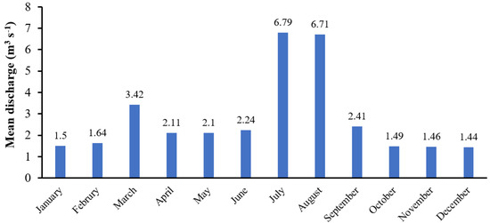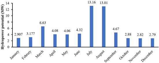 The mean discharge values range from 1.44 m3 s−1 to 6.79 m3 s−1 (Figure 2). The minimum discharge of Dor river is 1.44 m3 s−1 in the month of December, and it goes up to 6.71 m3 s−1–6.79 m3 s−1 in the months of August and July, respectively (Figure 2), which is the peak season of power shortage/outage in Abbottabad area. This higher discharge reflects a high amount of precipitation in the form of monsoon rainfall during July and August. This heavy precipitation results in faster run-off, which leads to a rapid increase in water volume in the river channel that, in turn, triggers a sudden surge in discharge. The discharge of Dor River is also high in March (Figure 2; 3.42 m3 s−1). The abnormally high discharge during March indicates the influence of snow melting. Since the catchment area does not have any glaciers that could continuously feed the Dor River, the possibility is that seasonal snowfalls in late winters result in the accumulation of snow that starts melting with a slight increase in temperatures during early spring times.