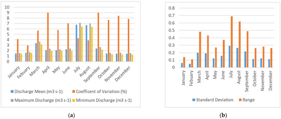 Comparison of Dor River mean discharge with (a). coefficient of variation and minimum and maximum discharge (b). with standard deviation and range.
