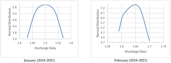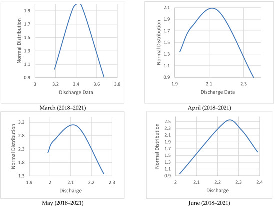 Normal distribution curve/bell curve of Dor River discharge from January to June (2018–2021).