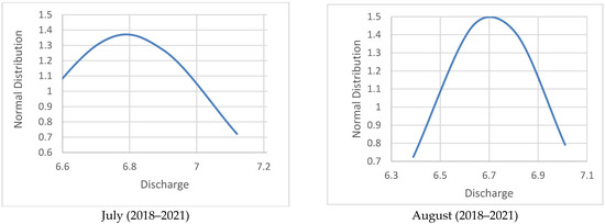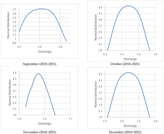 Normal distribution curve/bell curve of Dor River discharge from July to December (2018–2021).
