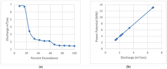 As shown in Figure 6, the minimum power potential for Dor River is 2.79 MW, which surges to 5.37 MW if the mean discharge value is used. The availability of minimum power potential is 100%, i.e., this power will be accessible throughout the year (Figure 7a). The utmost power capability of the river is about 13 MW, which will be available only in July and August, i.e., during 16% of the year (Figure 7a). The comparison of power potential vs. discharge for Dor River is shown in Figure 7b. These results indicate that the development of a hydropower project over Dor River can meet the major bulk of the power requirement for the Abbottabad area and thus resolve its power outage (load shedding) issue to a large extent.