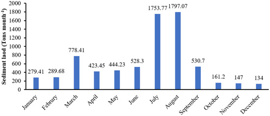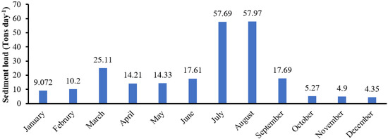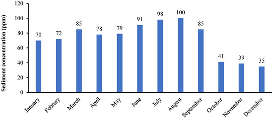 Determination of suspended sediment concentration and load is very important, especially during the designing phase of a hydropower project, since this concentration badly affects the turbines and leads to a reduction in the power potential and life span of the power plant. These finer silt and clay particles also show expansion due to the larger absorption of water [49,50,51,52,53]. The suspended sediment concentration in Dor River ranges from 35 ppm to 100 ppm (Figure 8), while the mean daily suspended sediment load (SSL) values for Dor River are shown in Figure 9. The per month SSL values range from 134 tons to 1797 tons (Figure 10), which means that the river has been carrying a lot of sediments that might have badly affected the life of the country’s largest, Tarbela reservoir.