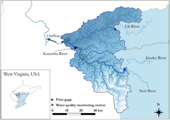 We focused on the Kanawha River in West Virginia, which is one of the tributaries of the Ohio River in the Central Appalachian Region. The drainage area of the Kanawha River includes a dense chemical industry near urban areas settled for more than a century as well as mining activities for coal and shale gas that altogether caused significant water pollution [4,20,21,22,23]. These anthropogenic activities discharge wastewater to streams together with scattered agriculture runoffs from riverine zones. Therefore, this drainage area has been subjected to local discharges such as the national pollutant discharge elimination system (NPDES). The Kanawha River encompasses approximately 31,724 km2 with many types of wastes, hypoxic conditions and endangering aquatic ecosystems [23]. The effects of rainstorms in this study area were investigated taking into account water chemistry changes that propagate downstream and may impair aquatic life conditions and the adequacy of water for different uses.