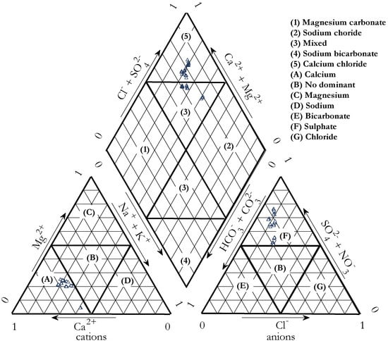 All major ions indicated in Table 1 were converted to meq (%) and plotted in the Piper diagram. Cations and anions diagrams were projected into a combined anions–cations diamond plot (Figure 2). Hydrochemical facies aided in the classification of the water chemistry type. A cations diagram had a prevalent dominance of Ca2+ combined with contributions between 15% and 30% of Na+ + K+ and between 35% and 50% of Mg2+. The anions diagram remarkably indicated that water samples fall on the upper corner, implying a SO42− dominated lithology; however, those water samples also defined ranges within 5% and 20% for Cl− and within 15% and 30% for HCO3−. Based on the central diamond, water samples were identified as calcium-chloride. In addition, those water samples had alkaline earth elements (Ca2+ and Mg2+) exceeding alkalis (Na+ and K+). Furthermore, the strong acids (Cl− and SO42−) were dominant over weak acids (HCO3−).