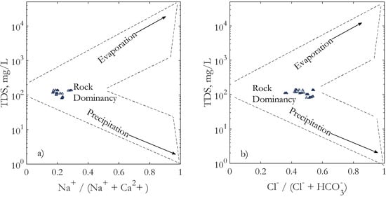A Gibbs diagram (Figure 3) identified that Na+/(Na+ + Ca2+) was between 0.15 and 0.3 and Cl−/(Cl− + HCO3−) was between 0.35 and 0.55 when dealing with TDS between 50 mg/L and 120 mg/L. In addition, the Gibbs diagram indicated that rock weathering mainly contributed to the composition of TDS with respect to other mechanisms such as biota, discharges of pollutants to the river and effects of precipitation.