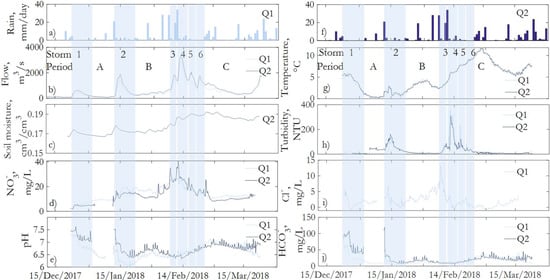 Catchment characteristics (Figure 1) and climate data were used to estimate flow (Figure 4b) following a developed HSPF hydrologic model. The HSPF hydrologic model was calibrated and validated to predict flow in Q1 and Q2, having a performance of NSE and PBIAS equal to 0.96 and 1.97%, respectively; further information of this HSPF model is available in [23]. Precipitation (Figure 4a,b) was retrieved from the near-real-time precipitation TRMM model [40]. Measurements of temperature, turbidity, NO3−, Cl− and pH (Figure 4d,e,g,i) were collected from the multi-probe sondes whereas soil moisture (Figure 4c) from the NASA GLDAS database and HCO3− (Figure 4i) was estimated using CO2Sys. During the period of observation, six rainstorms were identified using time series datasets which were intercalated with periods A, B and C (Figure 4b). The bounds at the start and end of each rainstorm were defined based on the minimum flow q. Each rainstorm was characterized through mean starting, maximum and ending flow, and duration of the rainstorm event (Table 2).