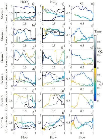 Hysteresis of six rainstorms using HCO3− (a–f), NO3− (g–l) and Cl− (m–r) in Q1 and Q2 locations along the Kanawha River. The transient response advances in Q1 and Q2 from 0 to 1 for any rainstorm.