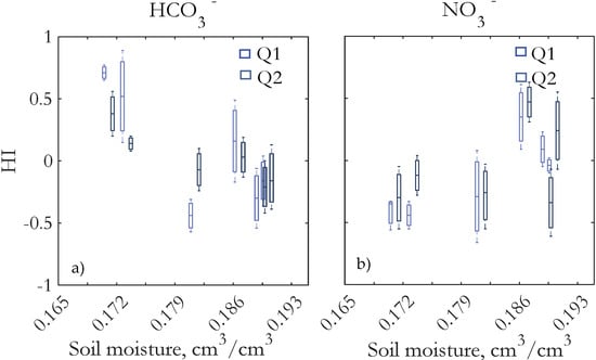 Concentrations of ions in the river are highly influenced by the catchment conditions [44]. However, the transport of ions is highly dependent on the precipitation regime that wets the catchment and causes surface runoff [45], which in turn is driven by the slope and land use/land cover [46]. To know the relationship between rainstorms and catchment wetness conditions, this study also assessed each rainstorm using the estimated soil moisture and the ionic mobilization by means of the HI in the six rainstorms (Figure 6). The soil moisture for each rainstorm was correlated with HI. It was found that the HI of HCO3− (Figure 6a) increased as the soil moisture decreased, whereas the HI of NO3− decreased as soil moisture decreased (Figure 6b). Such a relationship implied the influence of soil moisture in the hysteresis loop direction [47]. It should be noted also that the HI discrepancy between Q1 and Q2 for HCO3− and NO3− was the result of disturbances caused by contributions of point and nonpoint sources of pollutants added to the river in the drainage area shaped between these two locations.