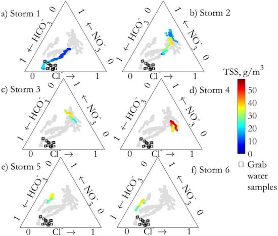 Anions diagram of HCO3−, NO3− and Cl− during six rainstorms (a–f) in conjunction with total suspended sediments (TSS) and grab water samples (☐) for location Q1 in the Kanawha River, West Virginia (gray footprint corresponds to all measurements of Figure 4).