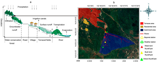 The Hani Rice Terraces, a kind of man-made agricultural ecosystem that has existed for over a millennium, are mainly in Yuanyang, Lvchun, Honghe, and Jinping counties in the southern Ailao Mountains of Yunnan Province, China. It was listed as a World Cultural Heritage site under UNESCO in 2003 and after that, has received much attention. These terraces are created and sustained by utilizing local natural and geographical conditions, and relying on the experience and intelligence of the local population. The landscape of the HRT presents a four-element isomorphism of “Forest-Village-Terrace-River” [27] (Figure 1a). Natural precipitation is regulated and redistributed by vegetation, such as forests, with a proportion of the precipitation moving directly into surface runoff, and a portion contributing to the groundwater through infiltration. Along the gullies, runoff, and groundwater flow through the village, into the terraced fields, where water flows down one piece of the terraced fields to another, from top to bottom, and finally into a river. Due to the hot climate conditions, the water evaporates, and this water vapor condenses into fog after ascending to a certain height. With the increase of altitude and a change as the climate, clouds and mist form, which leads to rain, which falls back into the forest, starting the next hydrological cycle.