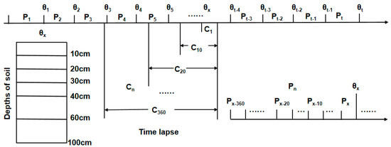 Time series of soil moisture from θ1 to θt; θx is soil moisture at time x and it is measured at different soil depths; Pn is every day precipitation; and Cn is cumulative precipitation during n days before test.