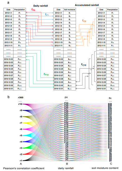 (a) Plot of Pearson’s correlation coefficient between soil moisture content and daily accumulated precipitation based on time series to rp1, rp5, rp10, rc5, and rc10for example. (b) Pearson’s correlation coefficient r (r1, r2, r3,..., r360) between soil moisture content and daily precipitation big data graph.