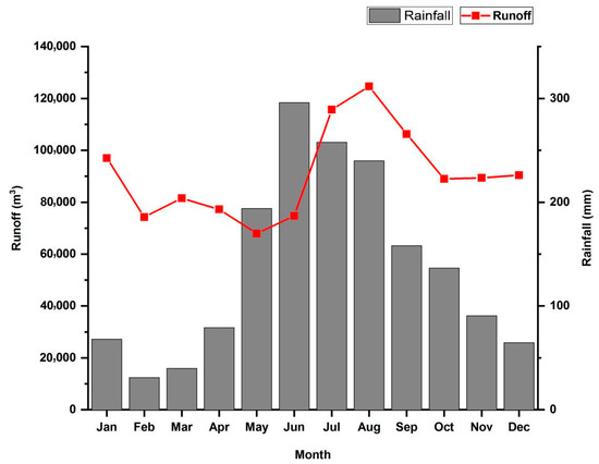There were obvious rainy and dry seasons in the HRT area (Figure 5). Rainy days and dry days accounted for 62% and 38%, respectively, during the study period. Days with light and moderate rain accounted for about 85% of the total precipitation days. As shown in Figure 5, average monthly precipitation reaches its maximum in June, but the highest runoff occurs in August, with maximum runoff occurring two months later than maximum precipitation. The average monthly precipitation reaches its minimum in February, but the minimum runoff occurs in May, and the minimum runoff are three months later than the minimum precipitation. Scilicet, the minimum runoff lagged behind the minimum precipitation by 3 months. The facts indicated that the groundwater/soil moisture probably played an important role in the regulation of runoff.