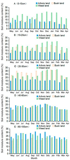 - On the daily scale: SMC of each layer was different in the 0–100 cm depth of layers in three site types: The highest SMC in arbors forest land occurred at 100 cm, but the highest SMC for both bush and weed land occurred at 20 cm; the lowest SMC occurred at 10 cm in arbors forest land, at 100 cm in bush land, and at 40 cm in weed land.