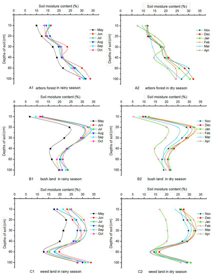 - On the seasonal scale (Figure 7): There were significant differences in SMC among the three different site types. The SMC in arbors forest land appeared as a linear curve in the rainy and dry seasons. The SMC also increases as the depth increases. The SMC curves of bush land in the rainy and dry seasons were waveform in shallow soil layers and linear in deep soil layers. The SMC increased with soil depth and reached the maximum value at 20 cm, then gradually decreased to the minimum value at 40 cm. SMC tended to be stable at 40 cm to 100 cm. The SMC curves of weed land showed a circular shape from 10 cm to 60 cm and linearly increased after reaching the minimum value at 60 cm.