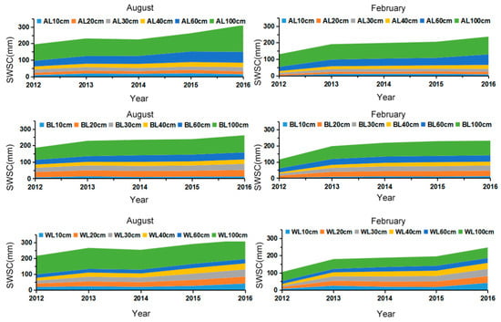 Figure 8. Soil water storage in August and February of different site types in 2012 to 2016 (SWSC: soil water storage capacity; AL: arbors forest land; BL: bush land; WL: weed land).