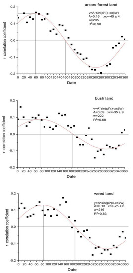 A scatter plot analysis was performed on Pearson’s correlation coefficient and the soil depth of 0–100 cm for three site types. Sine function fitting was performed to obtain date model diagrams of Pearson’s coefficient of daily precipitation and SMC for the three site types (Figure 9). The Pearson’s correlation coefficient never exceeded 0.2 in the three site types. Simulations indicate that daily precipitation has a limited effect on SMC. The correlations between daily precipitation and SMC were differences among the three different site types and it is ordered as follows: arbors forest land > weed land > bushland. The duration days of positive correlation between daily precipitation and SMC in forest, bush, and weed land are160 days, 185 days, and 190 days, respectively, before the test day. The dates with the highest positive correlation in forest, bush, and weed land are day 58, day 74, and day 82, respectively, before the test day.