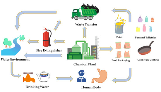 In addition to surface water and groundwater, PFCs contamination in drinking water is also a cause of concern. Drinking water is an important source of PFCs in the human body. Studies have shown that the level of PFOA in drinking water is directly proportional to the level of PFOA in the serum of local residents [59]. A thorough analysis of the water quality in the German Rhine River basin showed that PFCs are more concentrated in the water reservoirs. The PFOA levels in the blood of residents who drink this water source are five times higher than those in other areas [51].