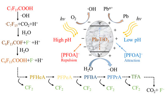 - Chen, M.-J.; Lo, S.-L.; Lee, Y.-C.; Kuo, J.; Wu, C.-H. Decomposition of perfluorooctanoic acid by ultraviolet light irradiation with Pb-modified titanium dioxide. J. Hazard. Mater. 2016, 303, 111–118. [Google Scholar] [CrossRef]