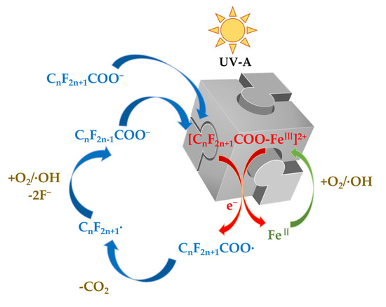 - Qian, L.; Georgi, A.; Gonzalez-Olmos, R.; Kopinke, F.-D. Degradation of perfluorooctanoic acid adsorbed on Fe-zeolites with molecular oxygen as oxidant under UV-A irradiation. Appl. Catal. B Environ. 2020, 278, 119283. [Google Scholar] [CrossRef]