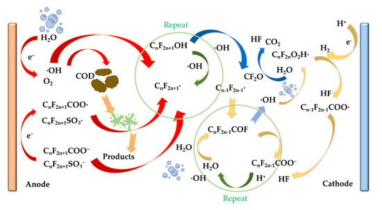 - Li, M.; Jin, Y.-T.; Cao, D.-Y.; Yang, L.-L.; Yan, J.-F.; Zhang, Z.-X.; Liu, Z.; Huang, L.-W.; Zhou, S.-Q.; Cheng, J.-L.; et al. Efficient decomposition of perfluorooctane sulfonate by electrochemical activation of peroxymonosulfate in aqueous solution: Efficacy, reaction mechanism, active sites, and application potential. Water Res. 2022, 221, 118778. [Google Scholar] [CrossRef] [PubMed]