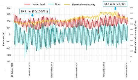 Water levels and electrical conductivity were measured in five wells. An example (well RGI_021) is illustrated at Figure 3. The comparison with the sea water level fluctuations due to tides showed a very strong and rapid influence of the boundary conditions (sea water level) on the aquifer. Water mineralization also fluctuates quickly in response to seawater intrusion. These measurements allow computing the tiding efficiency which is used for computing the diffusivity of the aquifer (see the following section). During the observation period, rainy events were rare. Two of them appeared: the 19.5 mm rain event between 30 October and 5 November 2018, which did not induce any change of level, and, contrarily, the 34.1 mm event of December 2018, which induced a water table rise followed by a mineralization decrease after a dilution effect.