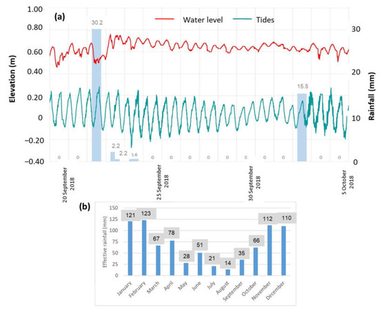 (a) Upper: water level fluctuations at well RGI_001 (red), ocean tides (green), and rainfall (blue histogram); (b) lower: monthly efficient rainfall computed using soil water budget with Smax = 20 mm.