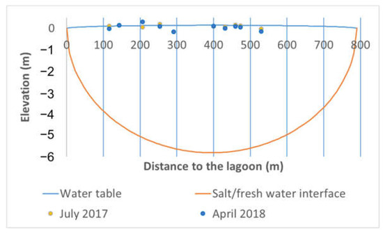 The conventional Henry’s solution was applied to two sections of Rangiroa Atoll, coupled with the Ghyben–Herzberg solution for the estimation of the depth of the freshwater/salt water sharp interface, in particular those surveyed by piezometric surveys in July 2017 and April 2018 (Figure 6) using the values of K and R obtained above.