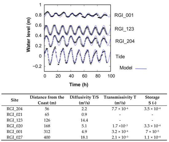 (Upper) Unimodal tidal model fitted over the interval 25–29 September 2018 with a period of 12.31 h (wells are classified according to distance from the coast and the average level is arbitrary) (Lower) Table with diffusivities obtained by unimodal analysis, transmissivities obtained by pumping tests and deduced storages.