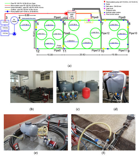 The layout of the water distribution network (a), overview of the water distribution network (b), pumping system (c), recirculation system (d), installation of the pump-reservoir system (e) and connection to the node (f).