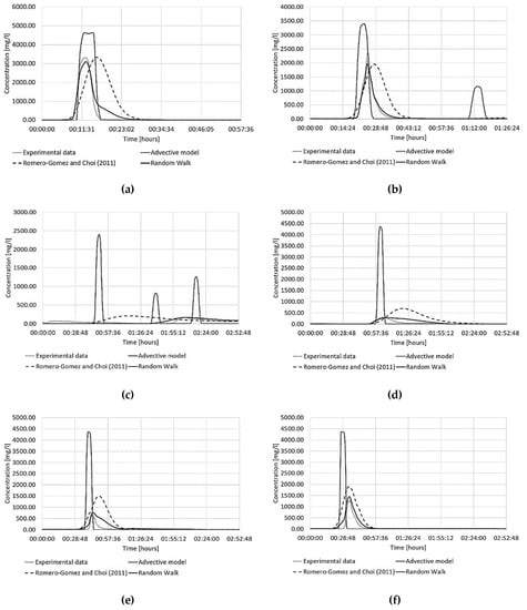 The results of the advective-dispersive model, which is based on the formulations of Romero-Gomez and Choi, obtained using the previously calibrated backwards and forwards coefficients differed more from other models and the trend of the experimental data. As shown in Figure 2, although the model could reproduce the dispersive effect of the contaminant in the network, it could not reproduce the behaviour of the experimental data. This is easily seen for the nodes in Figure 2c–e, where the model overestimated the contamination peaks and the persistence of the contaminant within the distribution network and reproduced a significantly anticipated event in Figure 2c but delayed events for all other nodes. The model performed slightly better for the node in Figure 2f, which had a higher coefficient of determination R2 than that calculated for the other nodes. In this node, the coexistence of the transition and laminar flow regimes, which had Reynolds values of 3598 and 200, respectively, was observed. The transition flow regime most likely dominated because the dispersive effects were not overpowering. Furthermore, the model could centre the contamination peak for the node above despite having overestimated its mass.