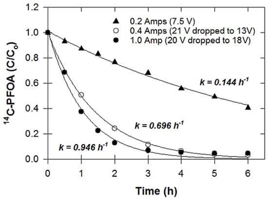 Potential is the major driving force for electrochemical oxidation of PFAS. Applied current density is a key experimental parameter that affects PFAS degradation and defluorination efficiency because it regulates the capability of the electron transfer rate and OH radical generation on the electrode surface. In the PFOA decomposition process, Ochiai et al. [24] found that when the current density was higher than 0.6 mA/cm2, the direct electron oxidation was no longer the main mechanism. Using DC settings that would produce 0.6 mA/cm2, we observed no change in PFOA concentrations. By using higher electrical current, however, we observed both near linear (zero) and first-order PFAS degradation rates (Figure 2). Based on previous research [25], we believe these observations can be explained by creating kinetic conditions that are either “current-controlled” or “mass-transport controlled”. Under current-controlled conditions, the rate-limiting condition is electron transfer at the BDD anode to form the perfluoroalkyl radical (Figure 1). When PFAS is in abundance (i.e., not limiting), the rate of degradation is constant and controlled by the electron transfer at the BDD interface (i.e., zero-order, Figure 2). Under mass-transport controlled, the PFAS becomes limiting, and the degradation rate is controlled by the transfer of the PFAS to the BDD electrode (Figure 2). In other words, the reaction becomes concentration-dependent or first-order. By increasing the amperage from 0.2 to 0.4 and 1.0 A, the reaction rate changed from current-controlled to concentration-dependent (Figure 2).