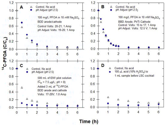 (A) Effect of pH adjustment on PFOA kinetics; (B) degradation of 14C-PFOA with BDD anode and Pt/Ti cathode, with and without pH adjustment; (C) degradation of 14C-PFOA in alkaline PFOA solution (pH 8) with BDD anode and cathode, with and without pH adjustment (pH adjust = 2.5); (D) effects of acidifying samples before mixing with liquid scintillation counting (LSC) cocktail.